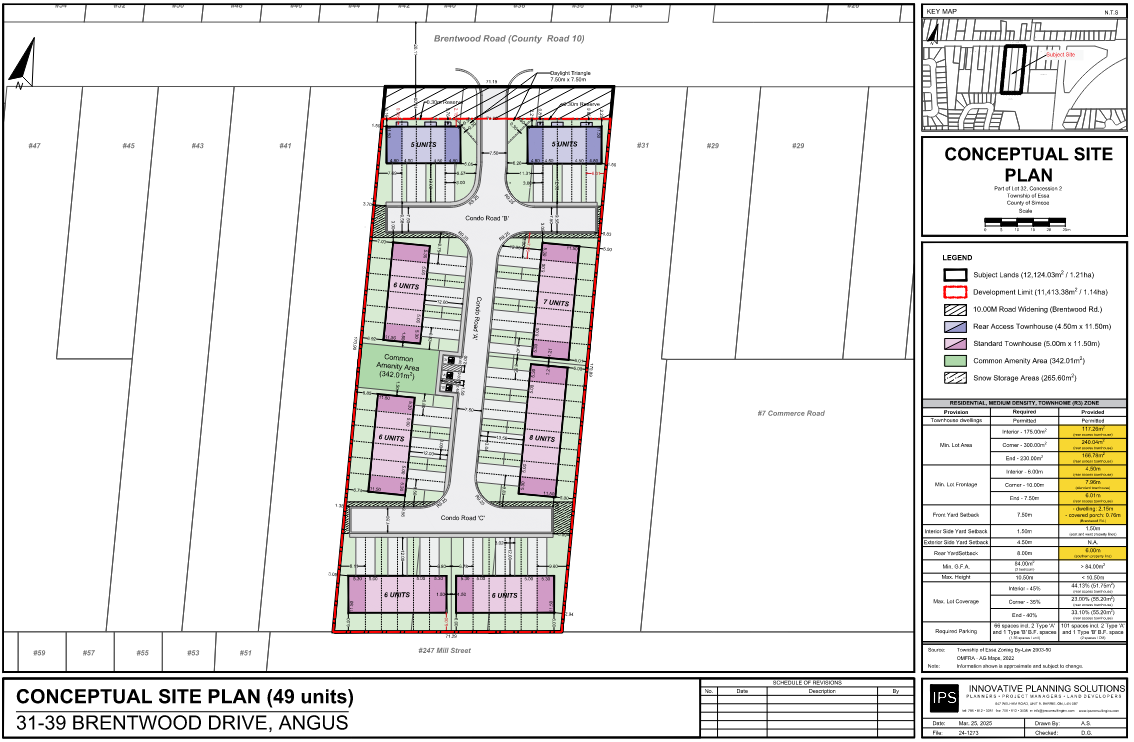 The proposed Official Plan Amendment would redesignate the lands from the existing Residential to Residential-Multiple. Additionally, the proposed Zoning By-law Amendment would rezone the lands from Residential, Low Density, Detached (R1) to Residential, Medium Density, townhome with Special Provisions (R3-XX). The proposed amendments would allow for the applicant to develop 8 townhouse blocks, with a total of 49 residential units. The development is designed to include a new private road off Brentwood Road (County Road 10) which will provide access to the site, unit driveways, as well as visitor parking spaces.  The site plan displayed above represents a concept of the proposal.